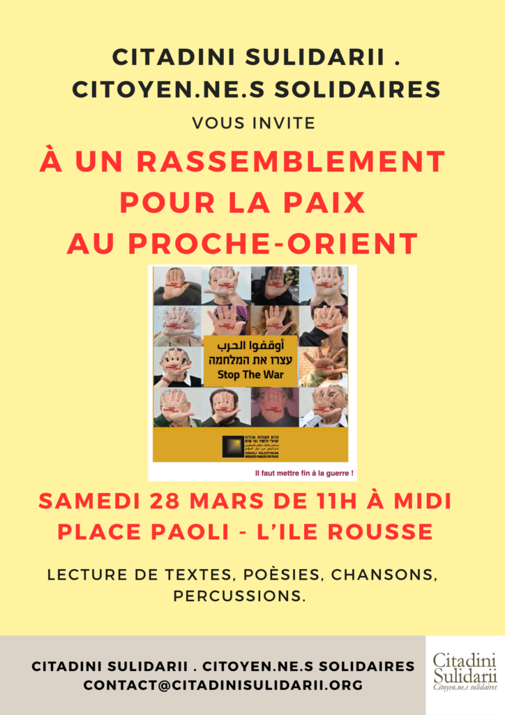 CITADINI SULIDARII vous invite à un rassemblement SAMEDI 28 MARS à 11h place Paoli à L’Île-Rousse pour dénoncer ces agressions et leurs responsables, appeler nos dirigeants à réagir pour faire cesser cette violence et oeuvrer à la mise en place d’une paix juste au Moyen-Orient.
